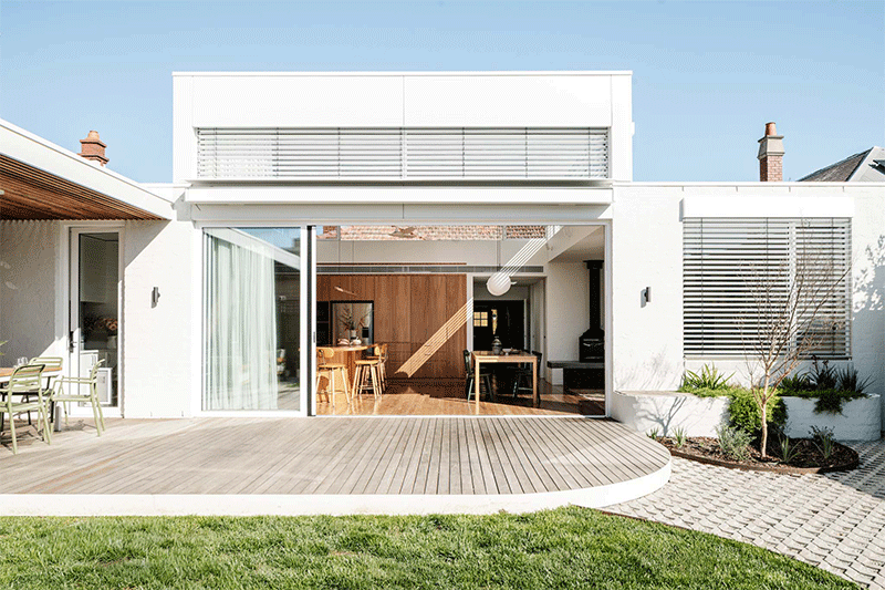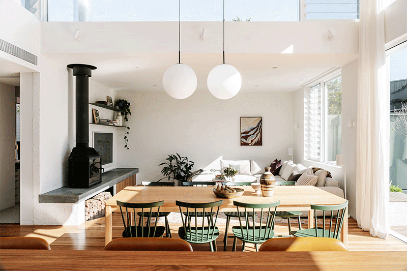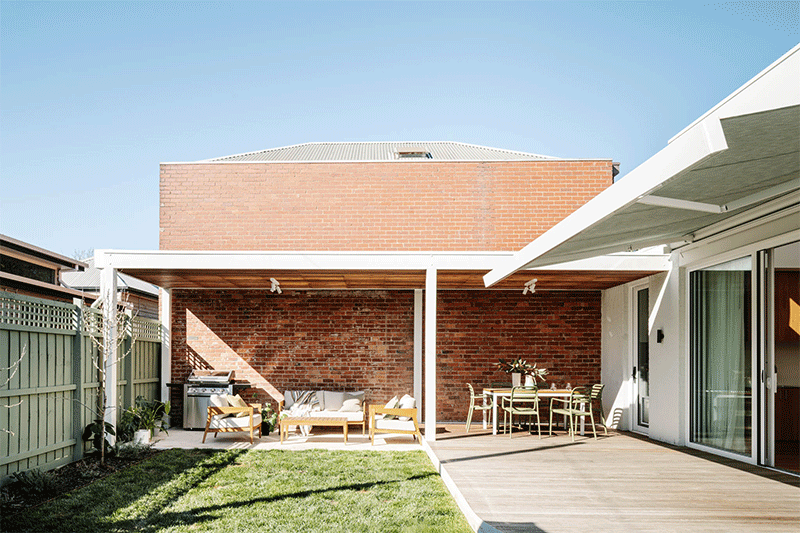 This intention is evident throughout the new open-plan kitchen, meals and living area, which forms the warm heart of the home. Blackbutt flooring and cabinetry are paired with bagged recycled bricks, materials that glow in the natural light pouring in from highlight windows and the north-facing backyard.
