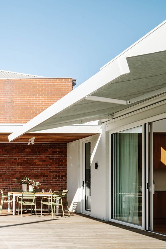 Over the back deck, a Warema Terrea K70 folding arm awning extends shade across the majority of the deck and the full-width glass doors that open onto it. “It creates an undercover outdoor space while also shading the floor-to-ceiling glazing,” says Callery. Together, the blinds and awning make expansive glazing comfortable year-round — filling the home with light when desired, without the heat or glare that can make such spaces uncomfortable.