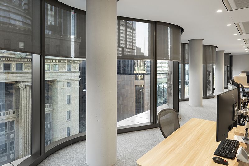 The fabric is a light filtering fabric to introduce daylight into the spaces when the blinds are down. The blinds are powered by super quiet motors to provide a harmonious and quiet working space for the tenants.”