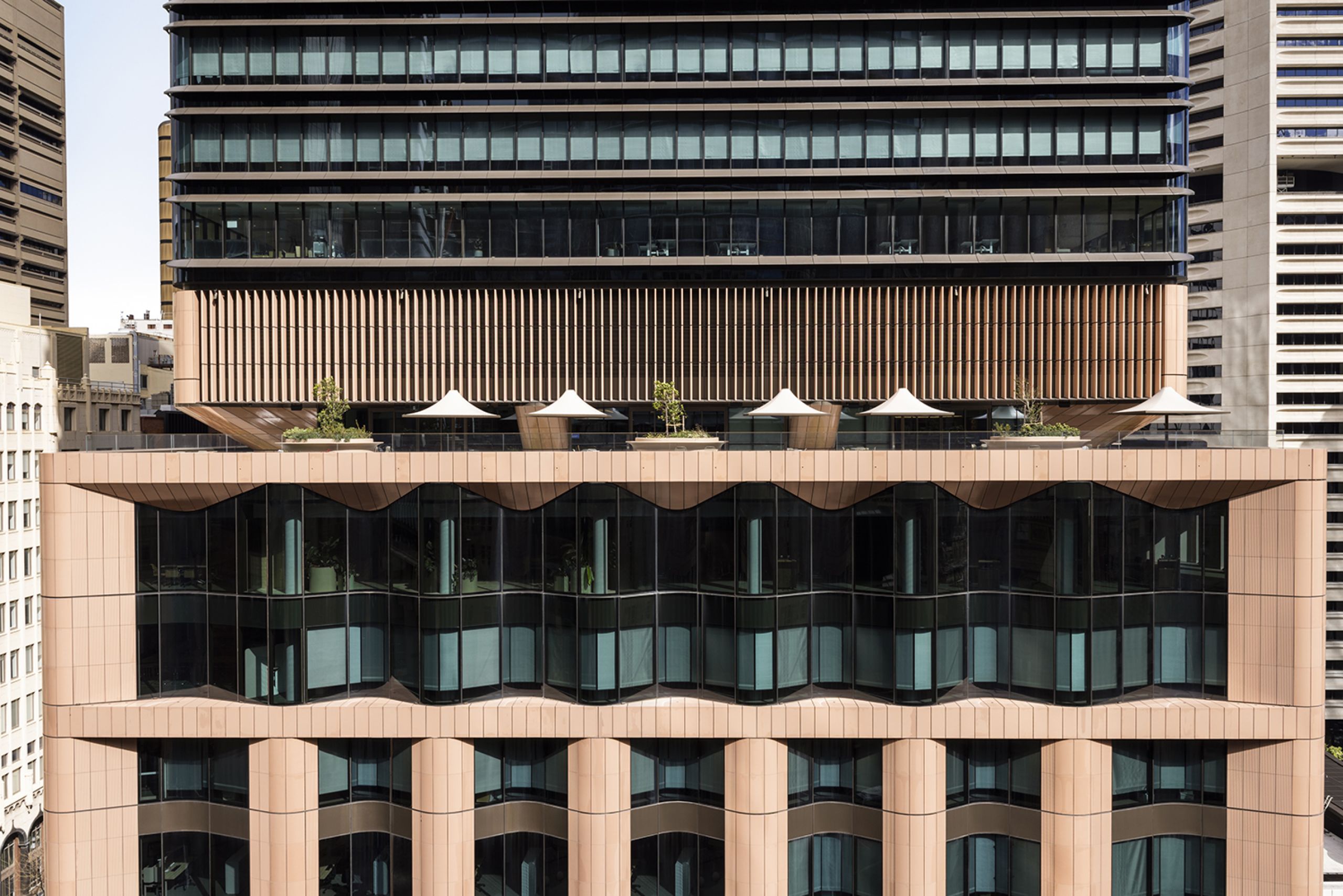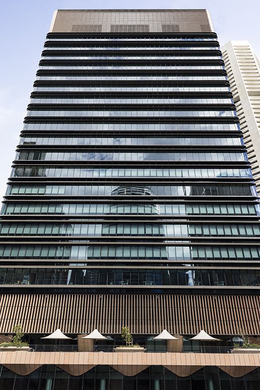 Peter Skinner, director of Shade Factor, describes how the tower’s form responds to its historic context while creating a modern office environment. “The south tower consists of a podium and a more transparent office tower above, which is set back from the street. Providing a deck on level nine, the podium aligns with the scale of the heritage buildings in Martin Place to provide continuity and preserve the scale of the streetscape.”