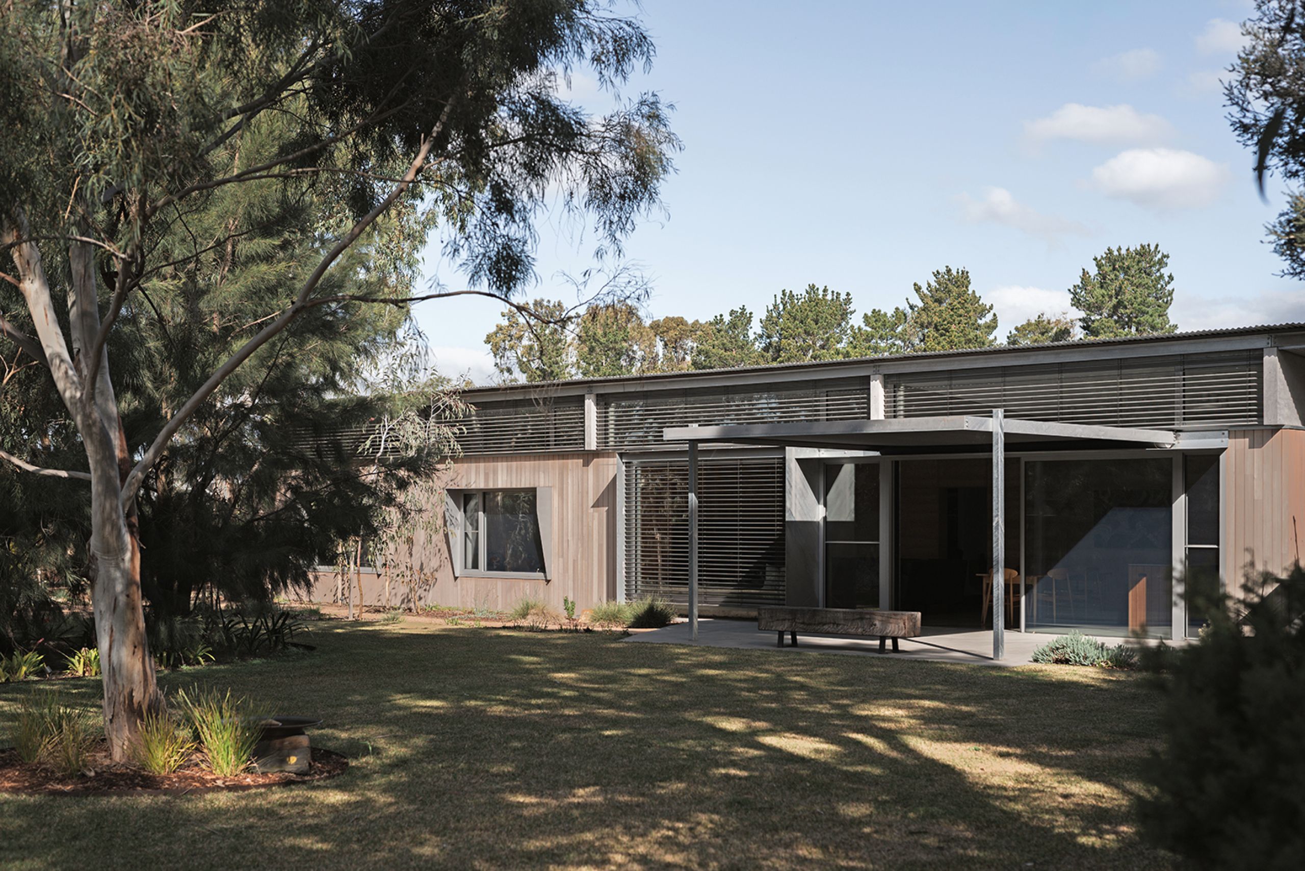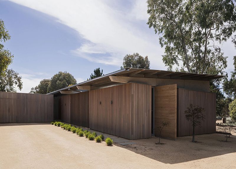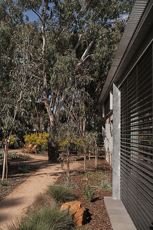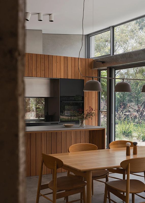 “Part of the brief was to be connected with the garden at all times from the house,” says Wiesebrock. “Being located in southern Victoria, where summers are hot and winters are chilly, summer shading was critical, as was allowing maximum sun in winter to hit the rammed earth wall down the centre of the house.”
