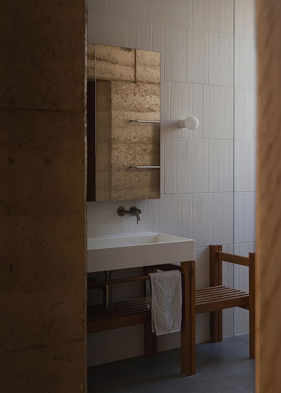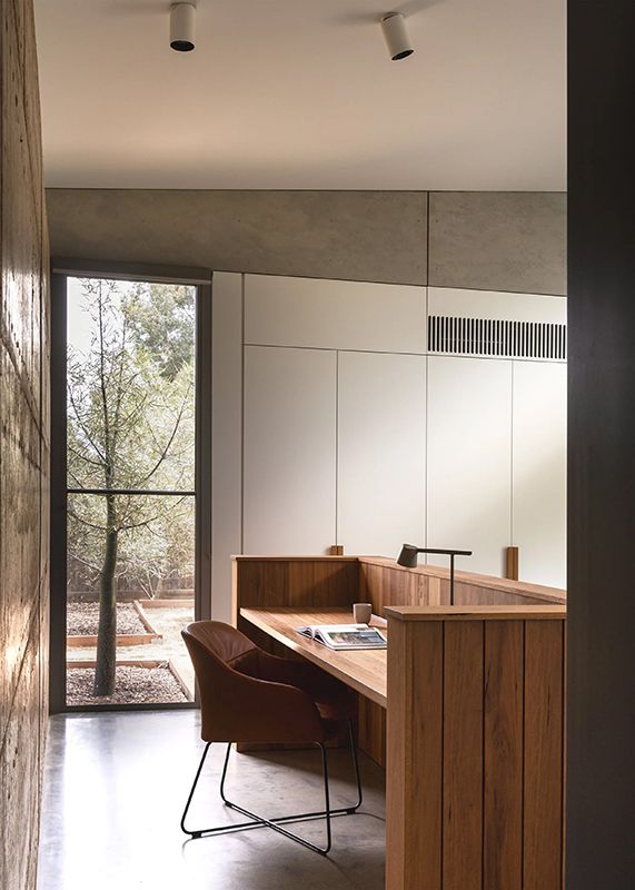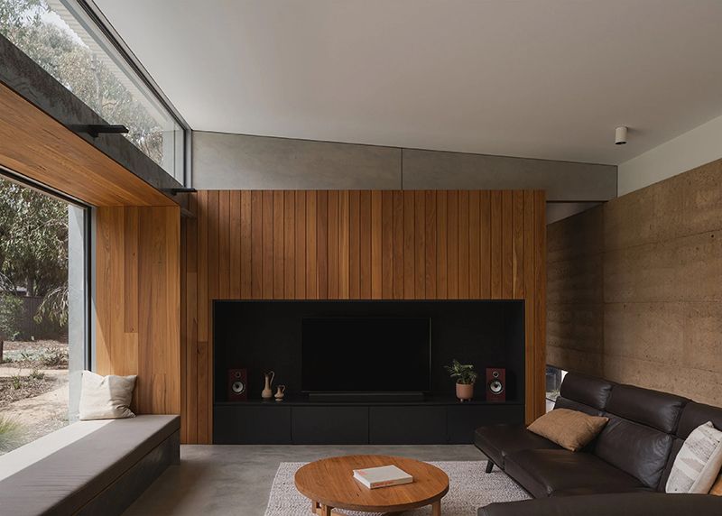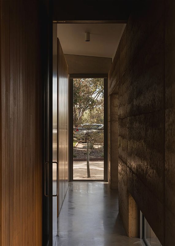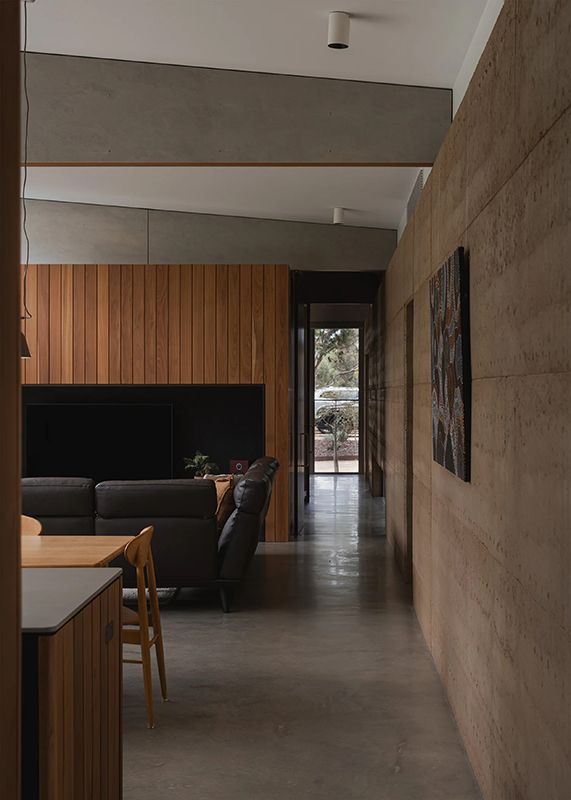 That foundation takes physical form in the rammed earth wall that runs through the centre of the home, inside and out. Built with material from the strata of the nearby You Yangs, the wall gives the building both character and stability. Its deep red tones and textured surface ground the interiors, while its mass helps regulate temperature throughout the year.