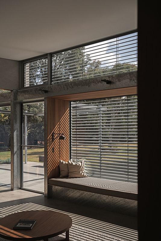 “The big benefit of having external blinds in the summer months is stopping the sun hitting the glass in the first place and eradicating that thermal gain,” says Wiesebrock. During the cooler months, the same blinds can be angled to reflect soft winter light deep into the interior. Their silver finish complements the home’s palette while “helping to direct the light onto the ceiling, giving this beautiful, soft, diffused light all day long.”