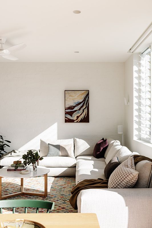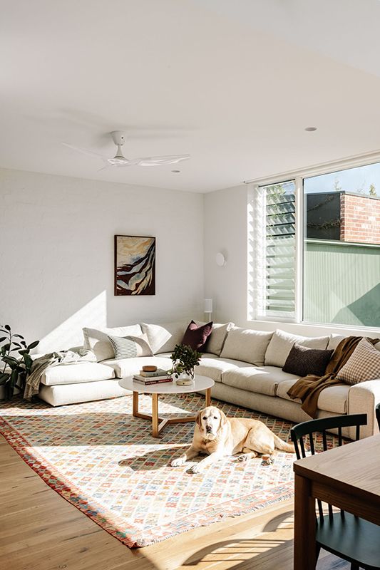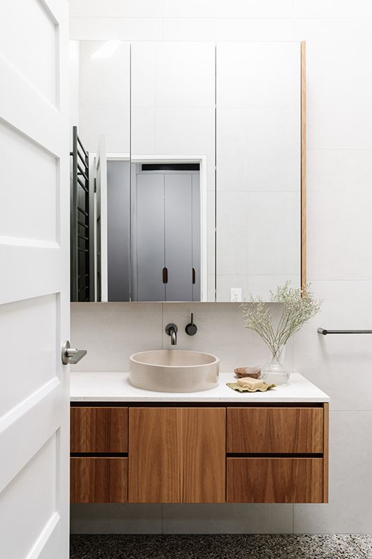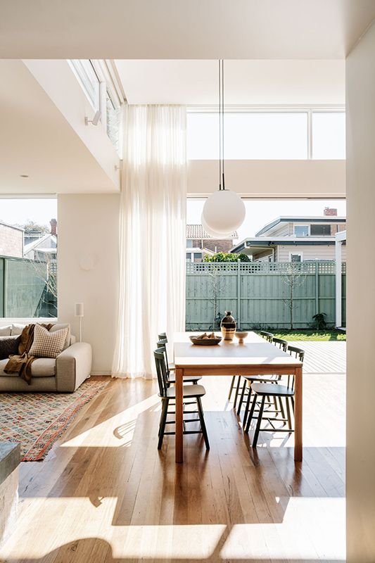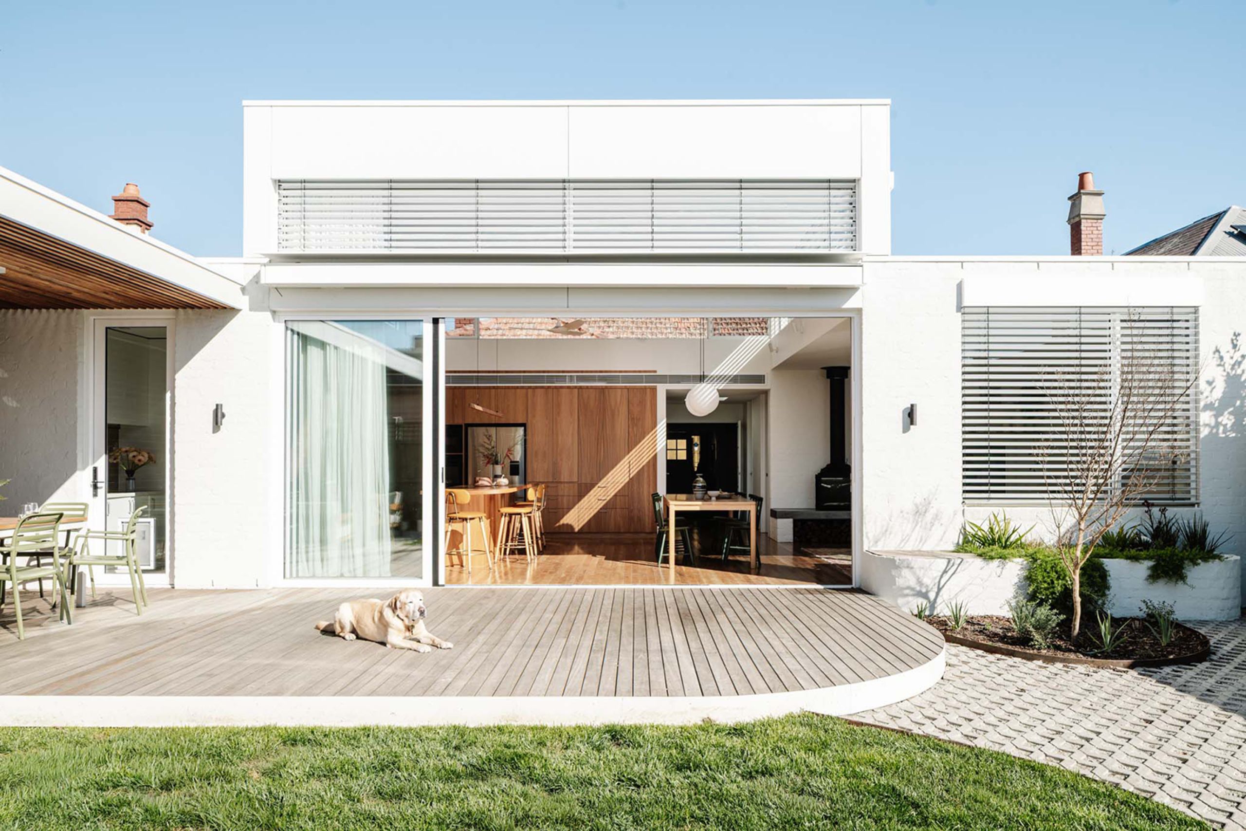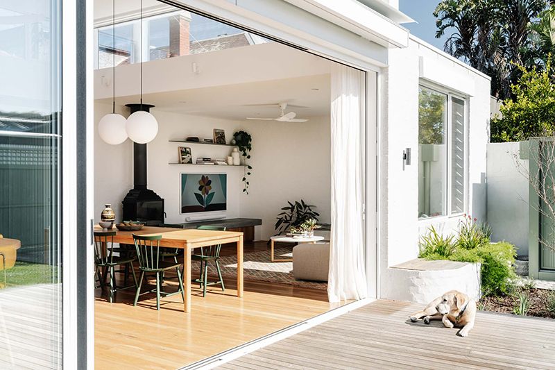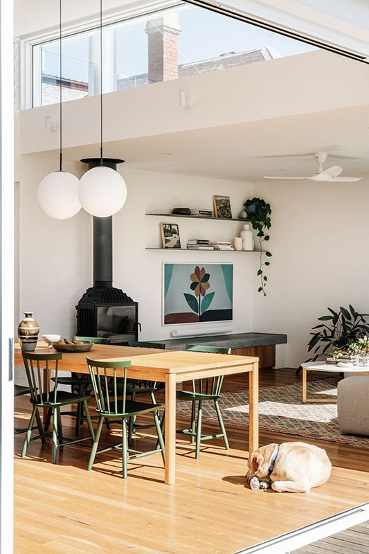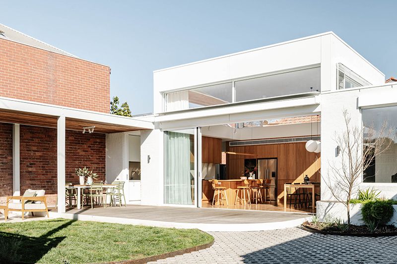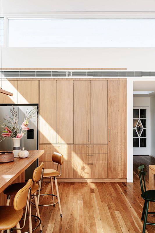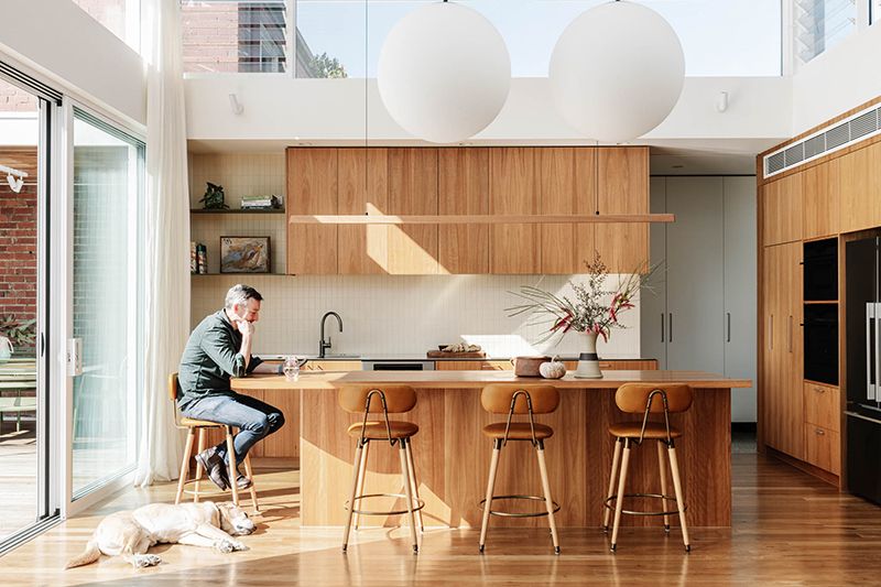 This intention is evident throughout the new open-plan kitchen, meals and living area, which forms the warm heart of the home. Blackbutt flooring and cabinetry are paired with bagged recycled bricks, materials that glow in the natural light pouring in from highlight windows and the north-facing backyard.