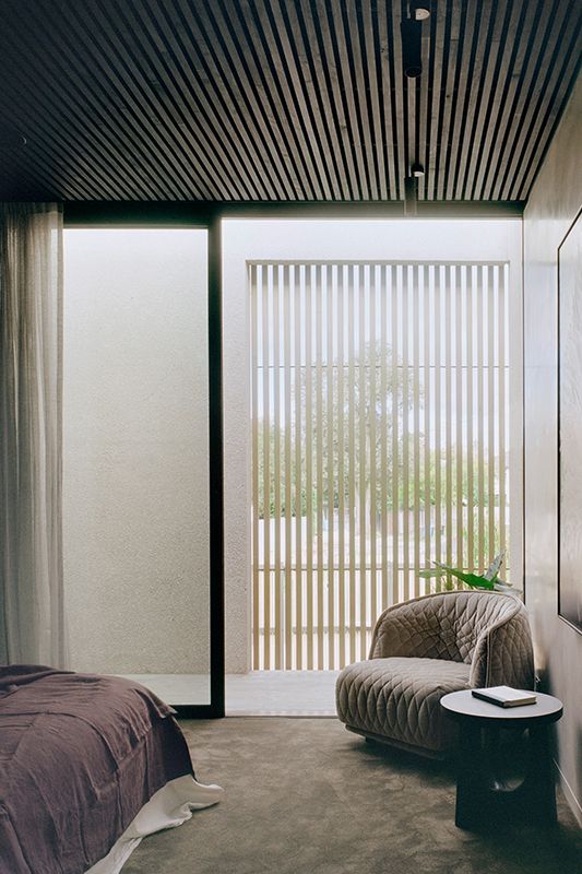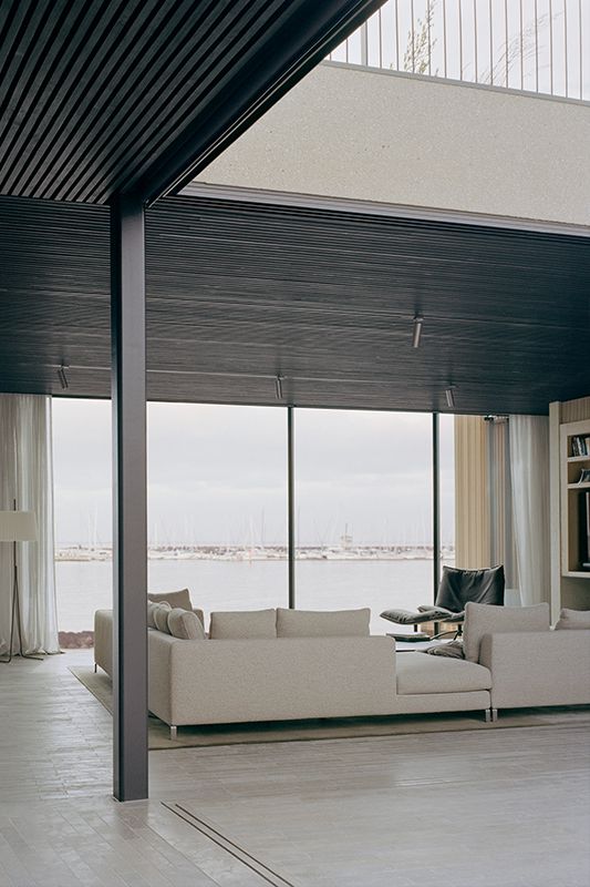 Timber battens add tactility and transparency, especially around the courtyard areas and the main facade. Internally, darker tones on the floors and ceilings draw attention to the panoramic bay views, creating a minimalistic yet warm atmosphere.
