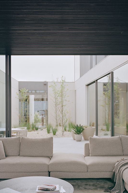 Materials play a pivotal role in achieving this aesthetic. The home predominantly uses precast concrete, treated in two distinct ways: fluted panels for the exterior and polished, sandblasted panels for the internal courtyard.