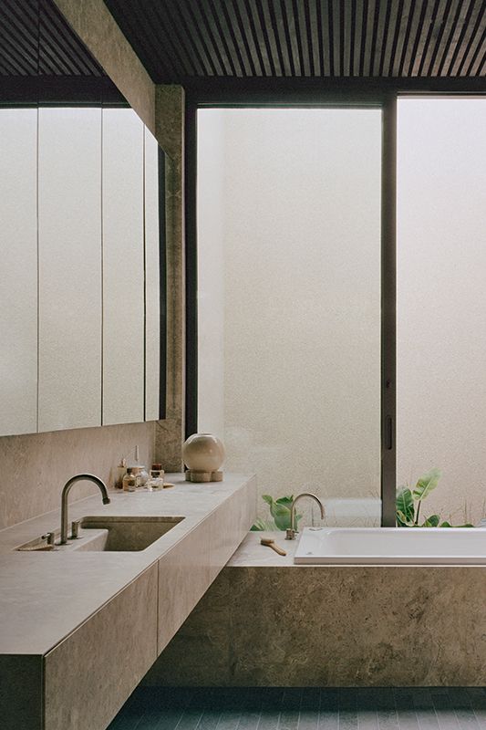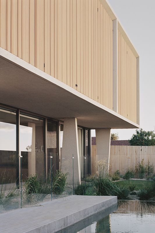 The design of the home draws inspiration from the Brighton sea baths, closely situated to the site. "We really wanted this building to reflect that characteristic, that relationship with a more organic landscape that moves around it," says Lovell.