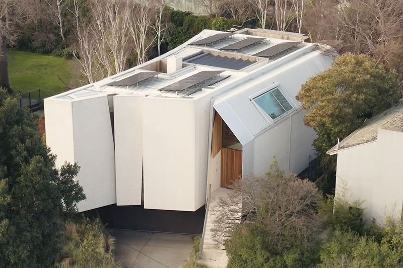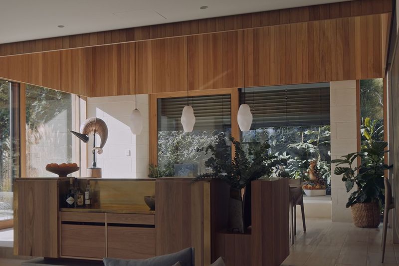 The materials used in the construction were sourced within Australia, minimising transportation-related carbon emissions; Materials include Mt Gambier limestone cladding from South Australia, siltstone floor tiling from Queensland, and recycled Australian hardwoods for timber surfaces all contribute to the house's sustainable ethos.