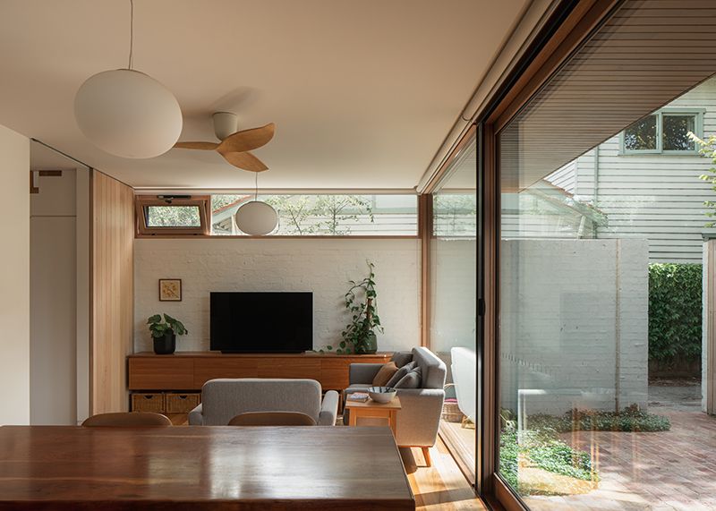 Clever design choices help the small space feel more generous, like full-height windows and doors that open fully onto the courtyard, and furniture lifted off the ground to create a sense of flow.