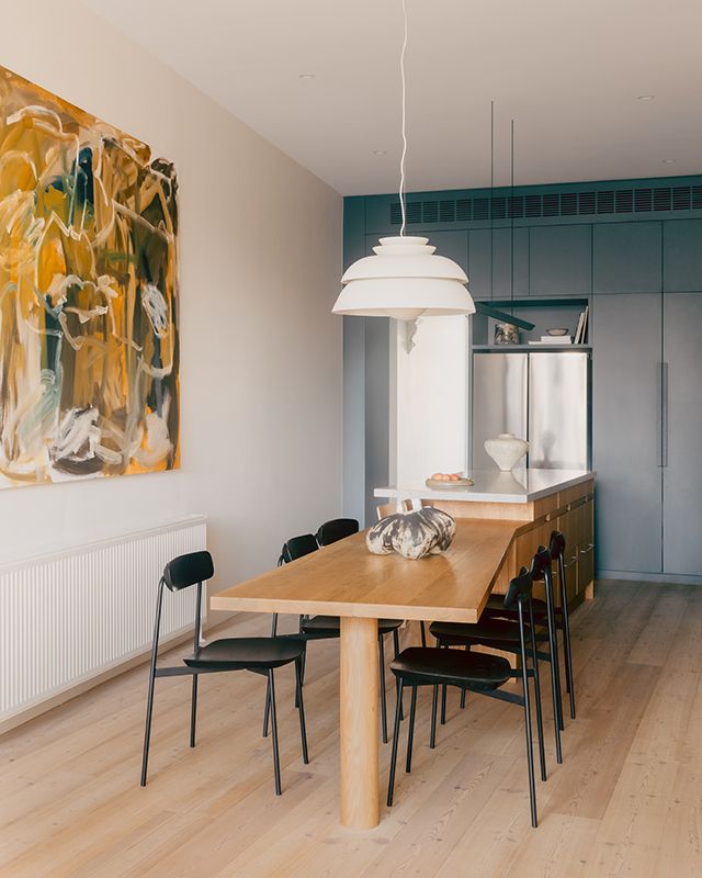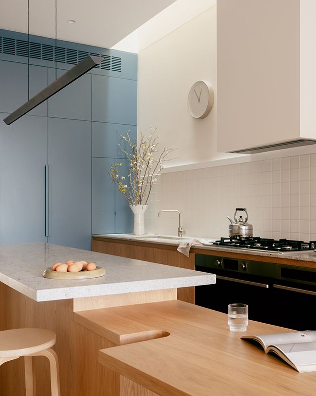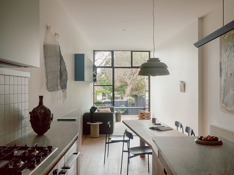 Space efficiency was a key focus in the redesign. The centrepiece of the new living area is a multifunctional piece of furniture that combines the dining table and kitchen island. “This approach maximised the sense of openness,” says Healey. “We designed the perimeter kitchen bench to taper down, creating an elegant surface for objects in the dining area.”