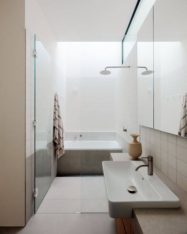 To achieve this, the rear living spaces were levelled into a single area, allowing daylight to penetrate further into the home. “We also introduced a two-story light shaft above the kitchen,” he adds. “This feature brings natural light over the kitchen bench and into the upstairs bathroom, connecting the spaces visually and spatially.”
