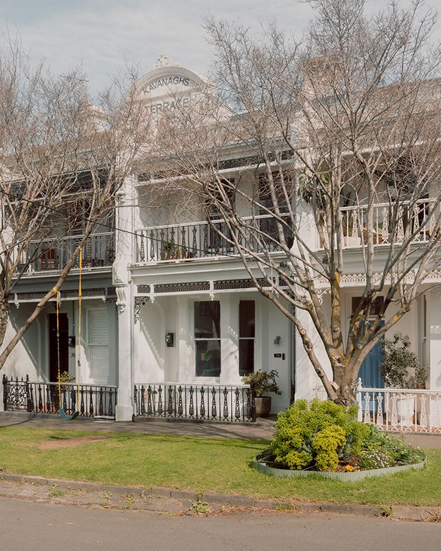 The home’s rear facade is an architectural statement, featuring handmade red bricks with matching mortar, a red steel eave, and custom perforated steel shutters. “We wanted the facade to feel like a monolithic extension of the home’s Victorian heritage,” says Healey. “But the closer you look, the more you see the level of craftsmanship and detail.”