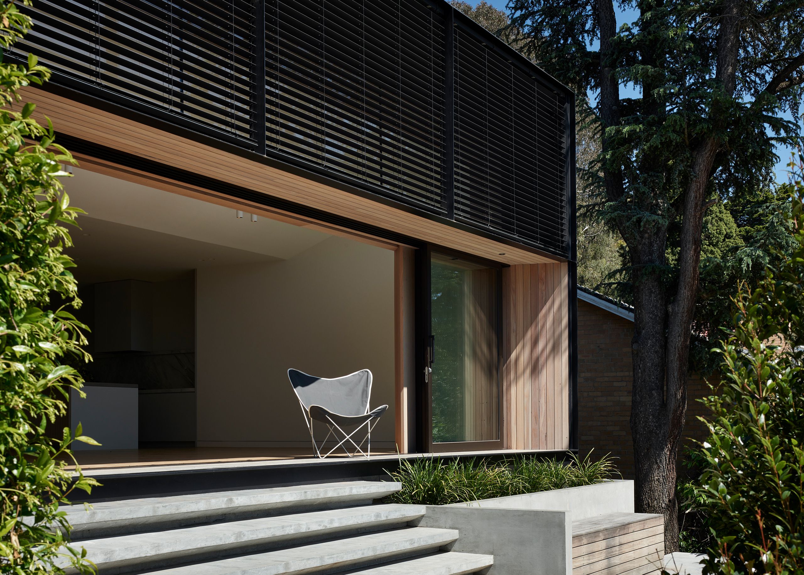 For the sliding doors, a deep solar eave lined in timber was used to shield them from excessive sunlight. Meanwhile, the higher windows received active protection through a series of motorised external venetian blinds.